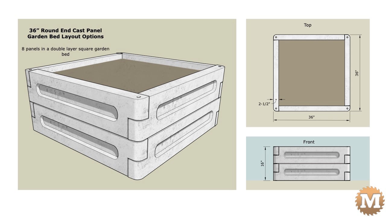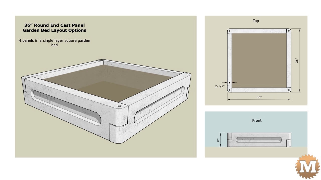 Here’s 4 x 36″ round end panels in a square bed. This bed layout can be cast with a single 36″ mold.