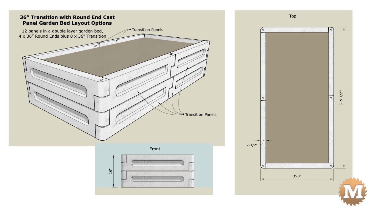 Here’s 2 x 36″ Round End Panels with 4 Transition Panels in a rectangular bed. This bed layout can be cast with this Transition Mold along with a 36″ Round End Mold.